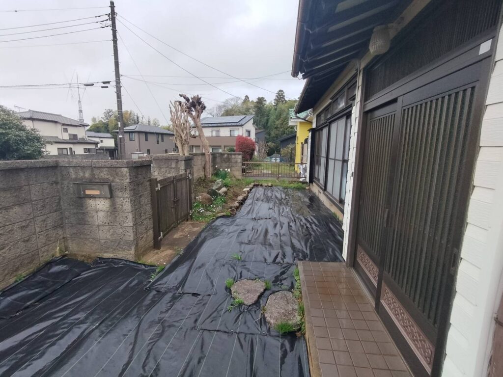 庭の伸び放題だった木を処分して、地面を慣らして、その上に防草シートを張りました。